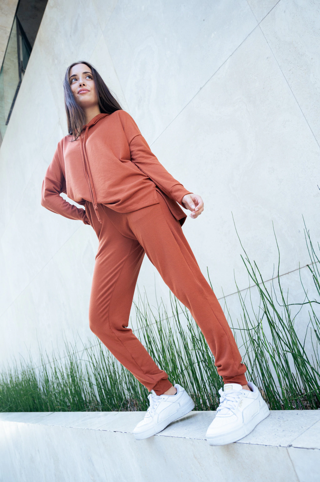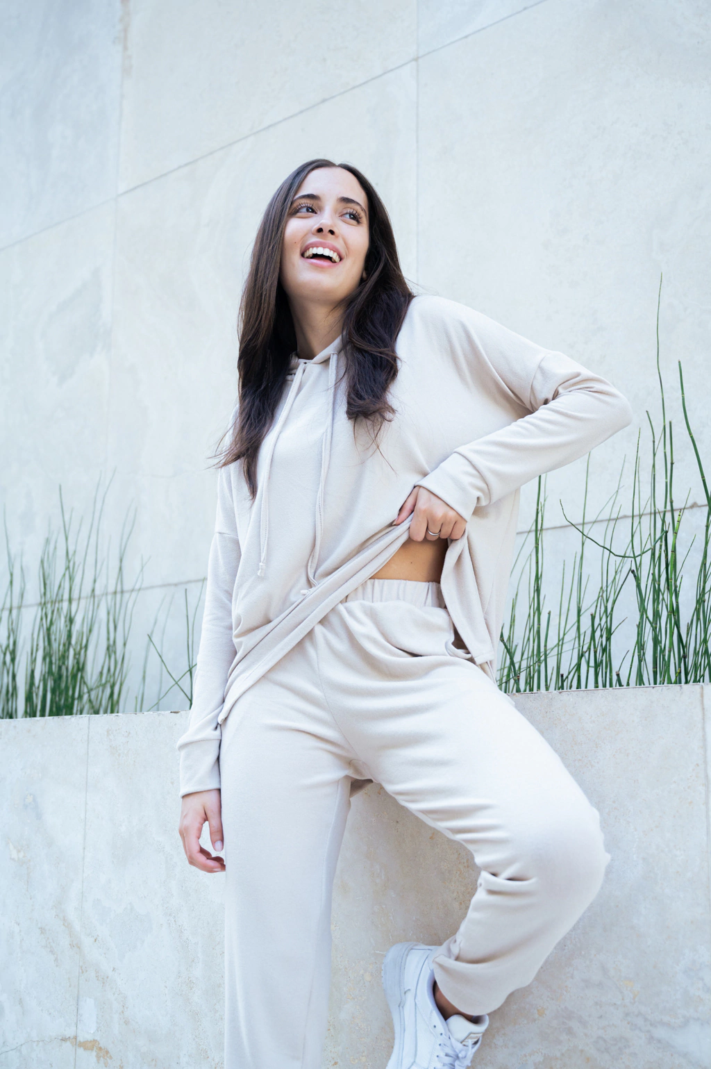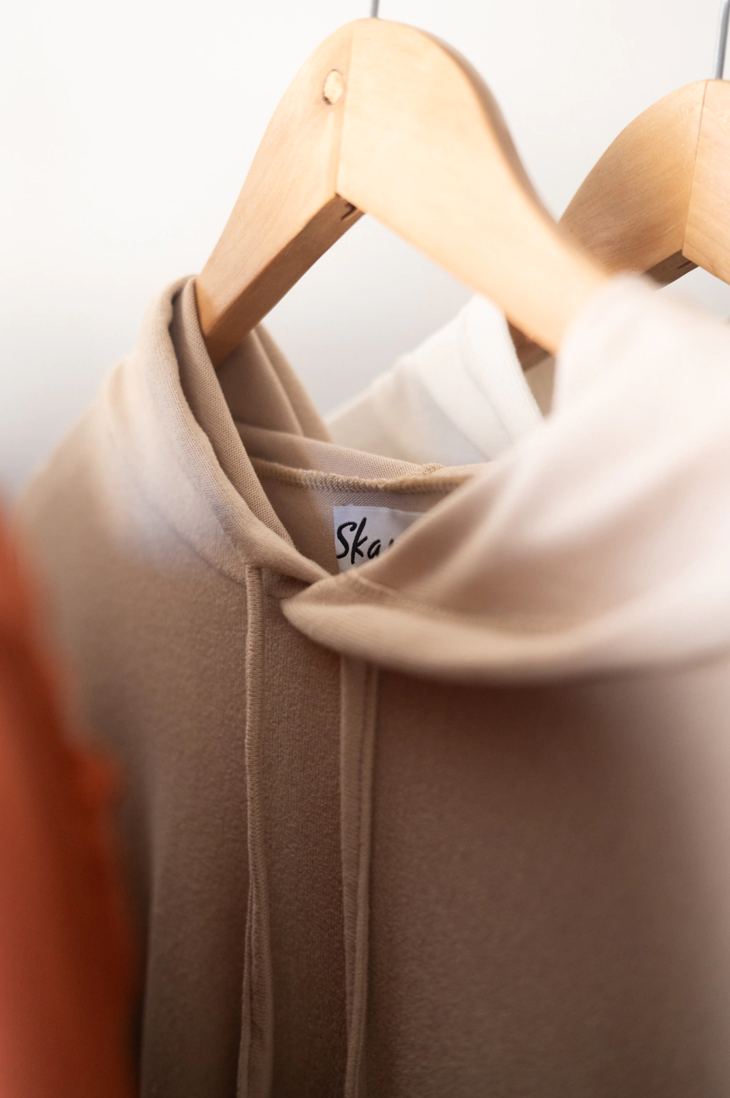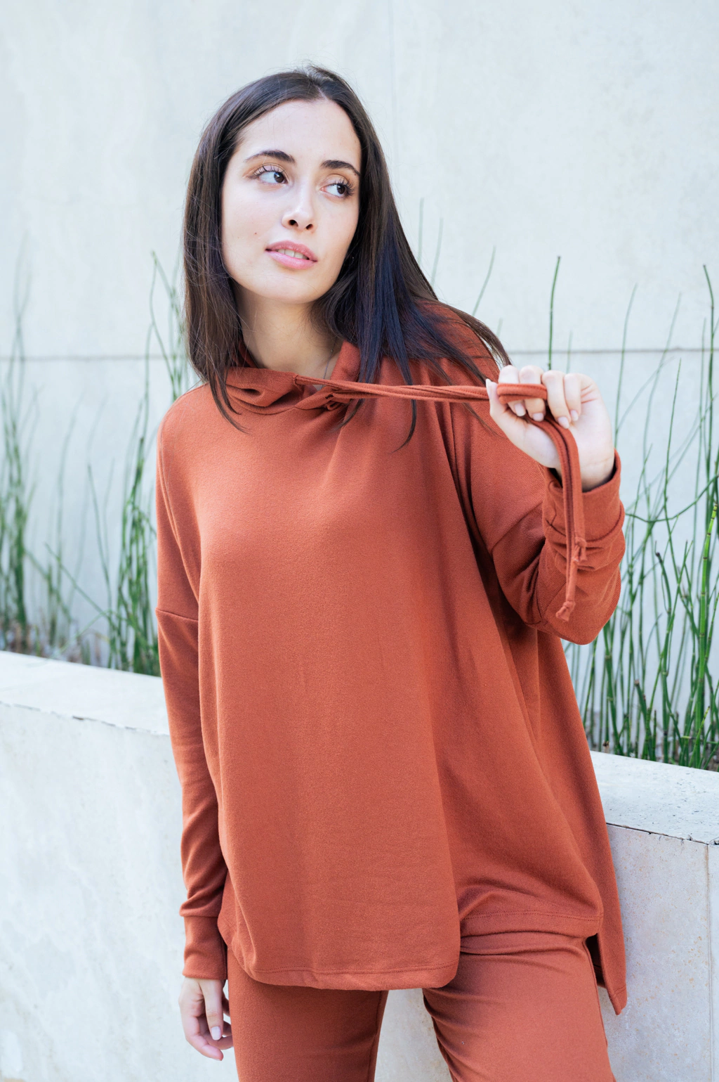 Buzo de lanilla premiun, con capucha y tajos, mas largo atras.