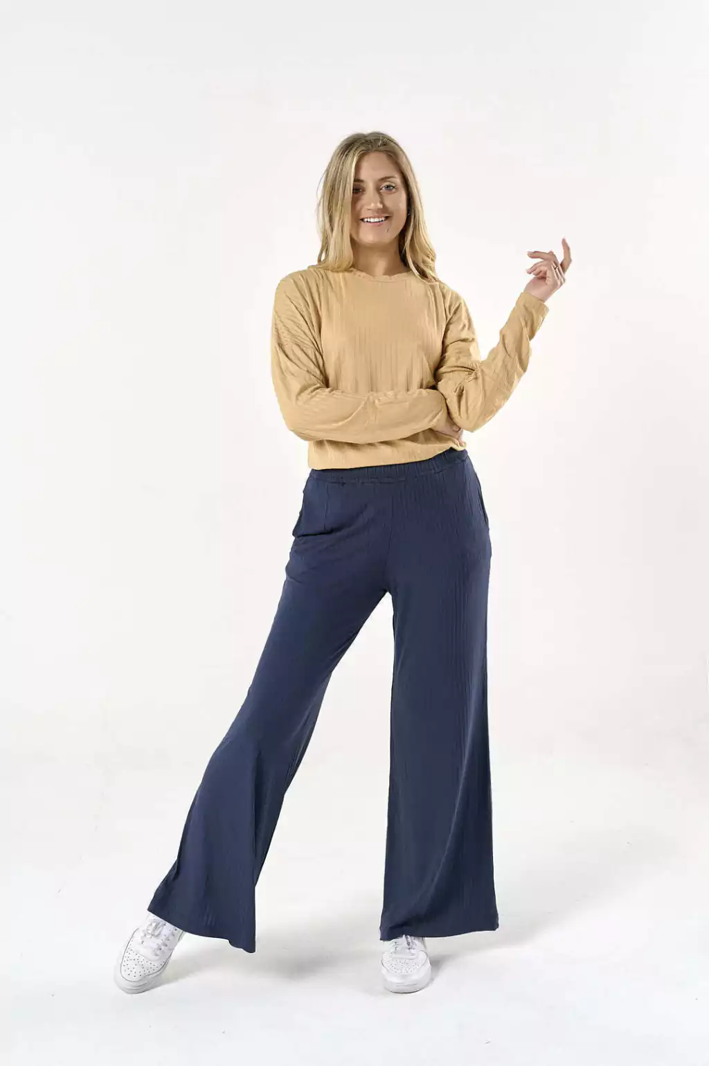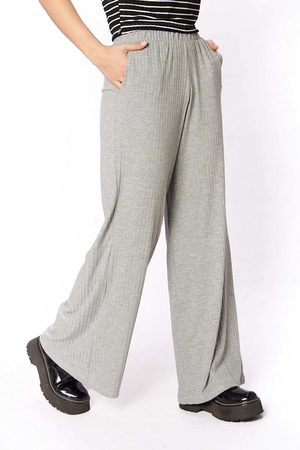 Pantalon oxford con bolsillos. Se hace campana en la botamanga. Tiene elástico fruncido en la cintura