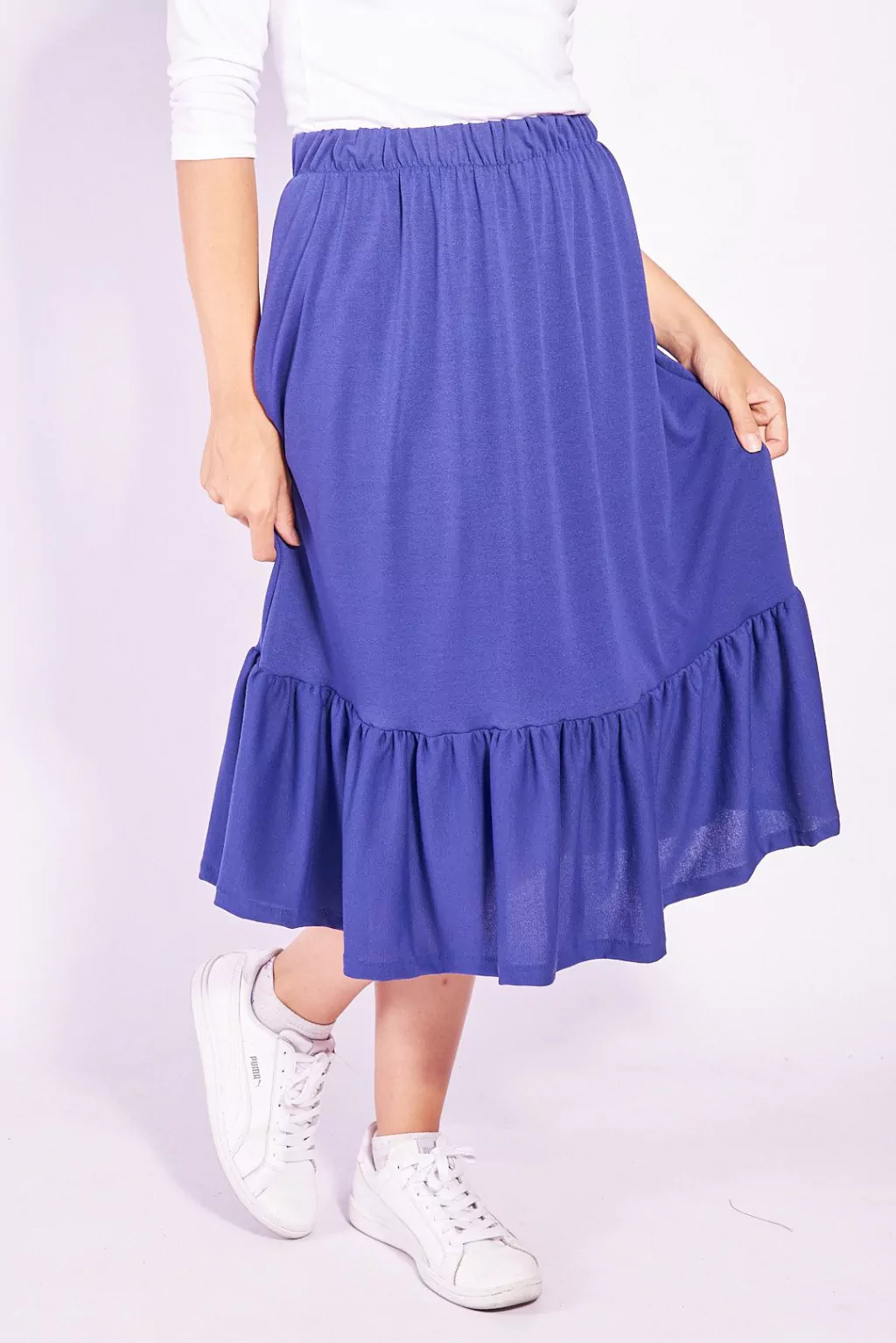 Pollera con volado , con elastico en la cintura. Tiene forro. De muy buena caida.