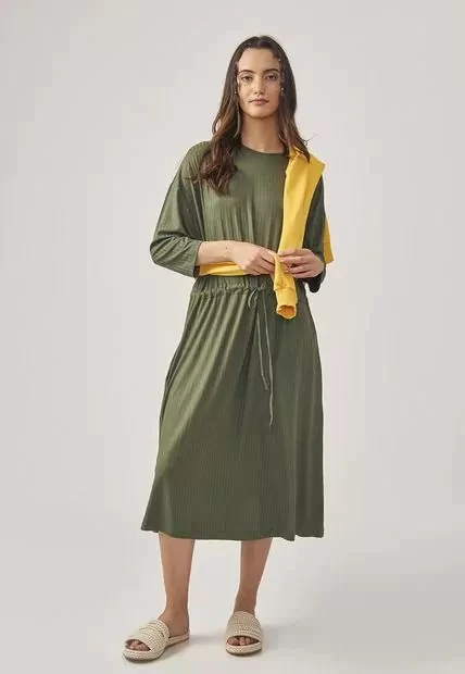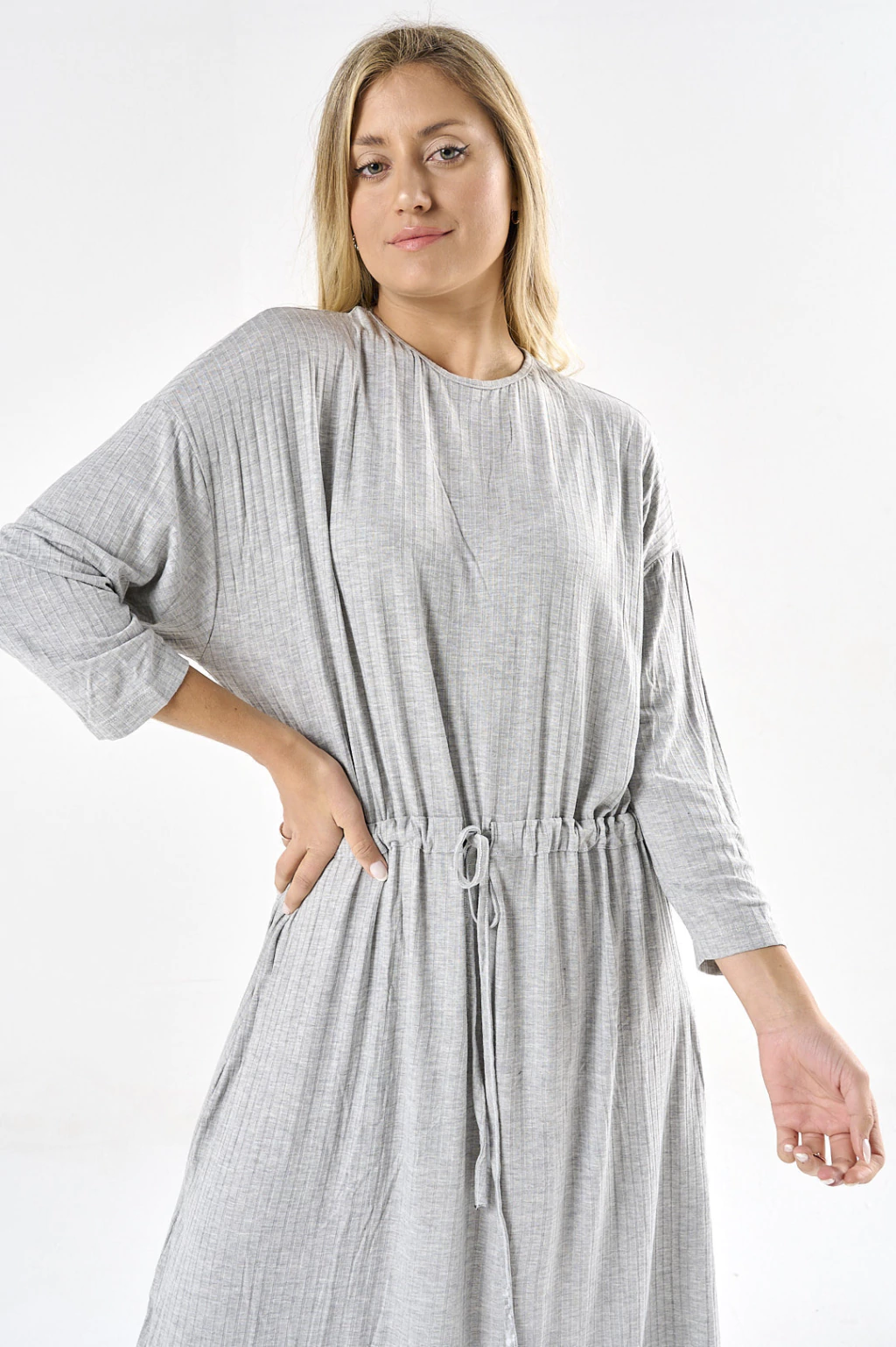 Vestido con lazo, bolsillos y manga rangla. Cuello redondo. Manga larga.
