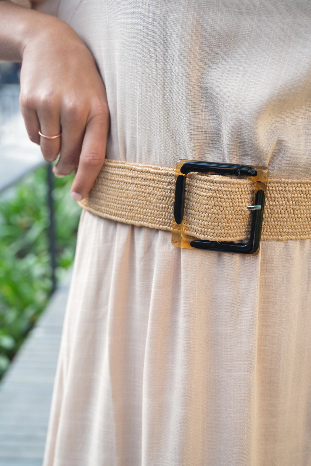 Vestido de lino con cuello redondo y ,boton en la espalda.